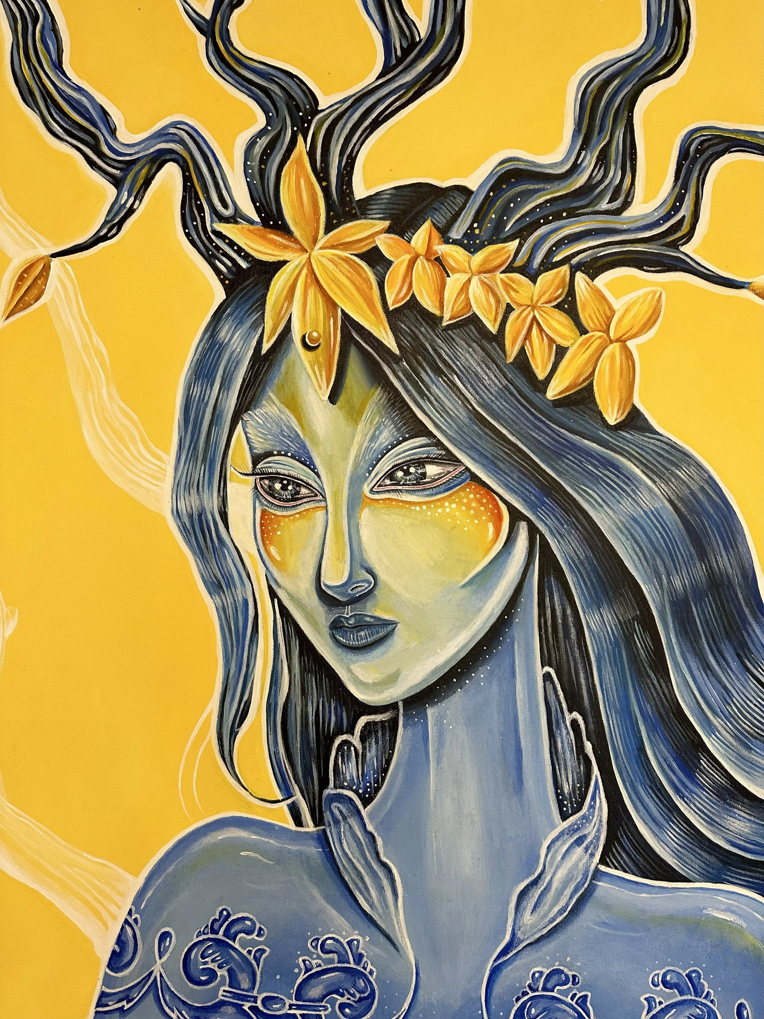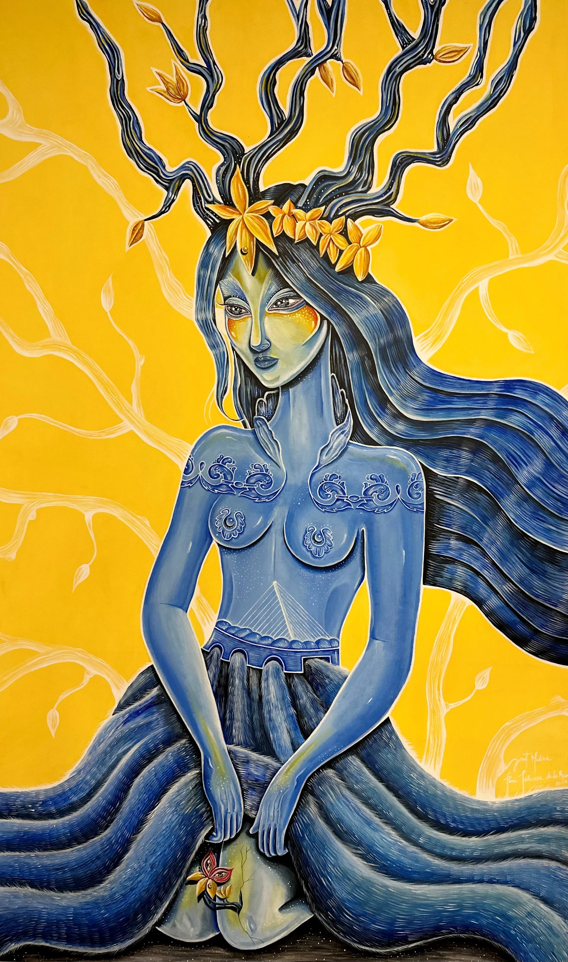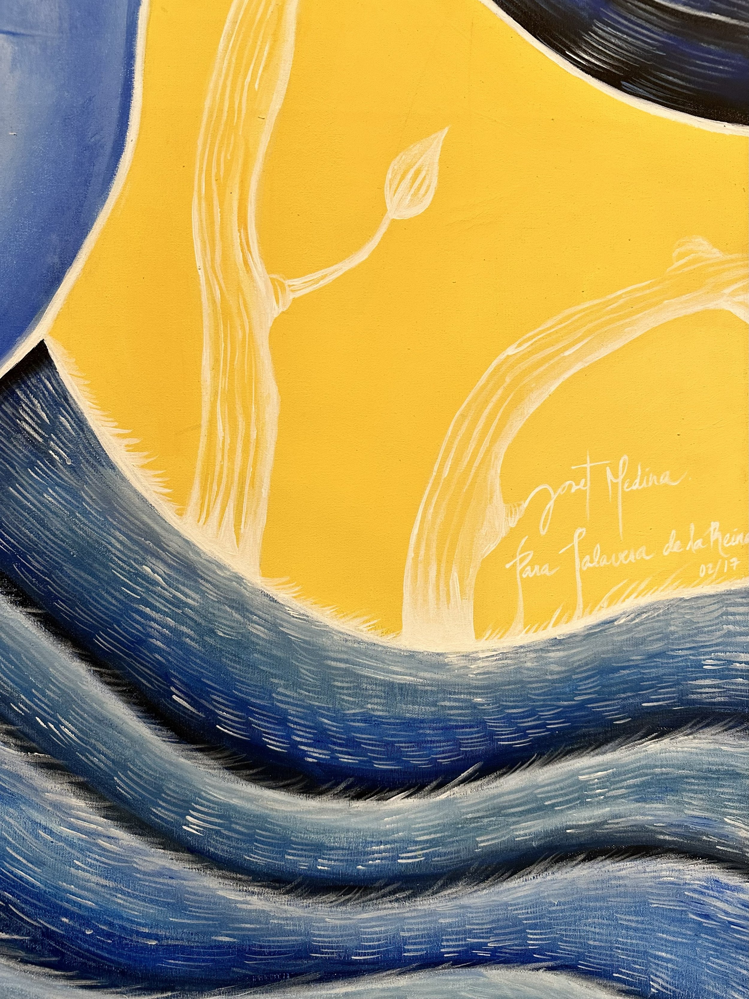 This piece carries profound emotional meaning for me. My mother and all my sisters now live in Talavera - part of the great exodus from a country that has been breaking apart, Venezuela. Through this painting, a part of me remains there too - stitching us together across distance. La Reina de Talavera represents not only the heritage and soul of the city, but also a moment of return and reunion, shared with my mother and husband after seven years away.